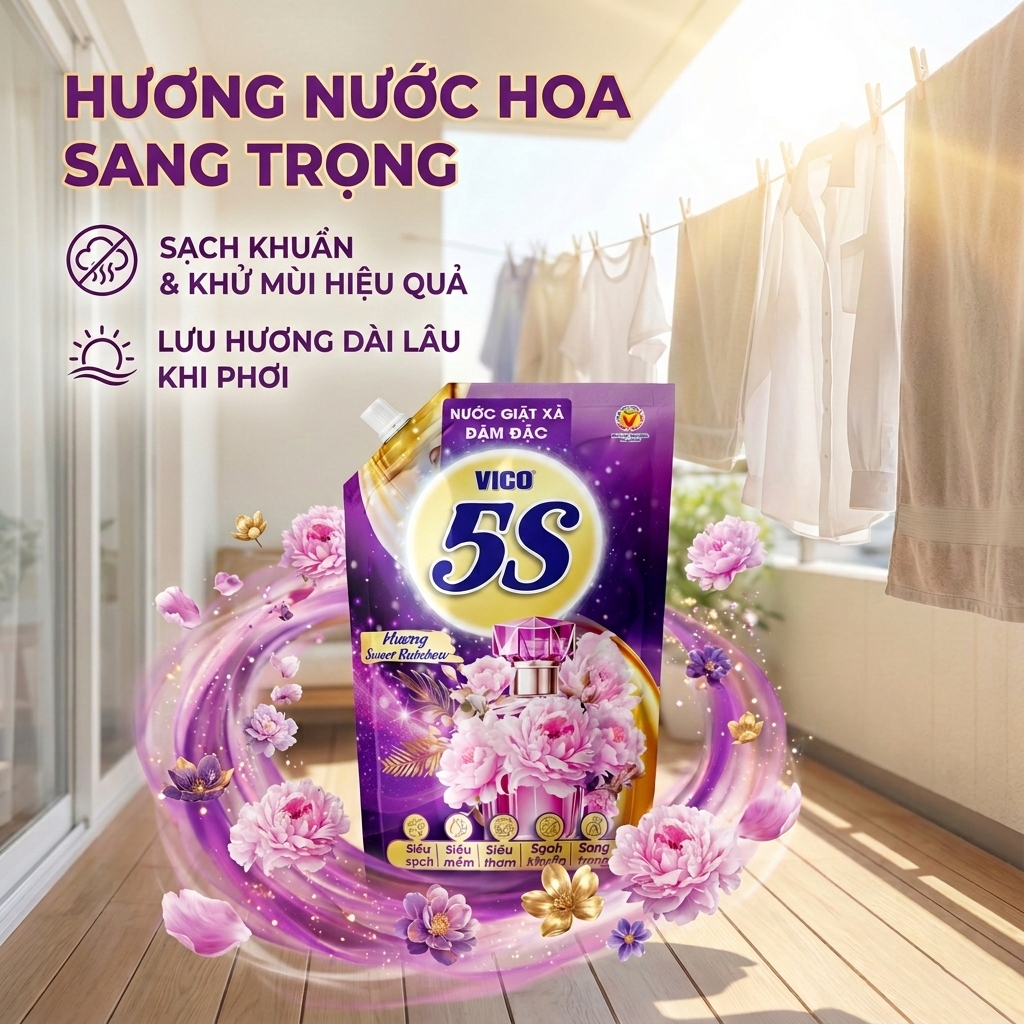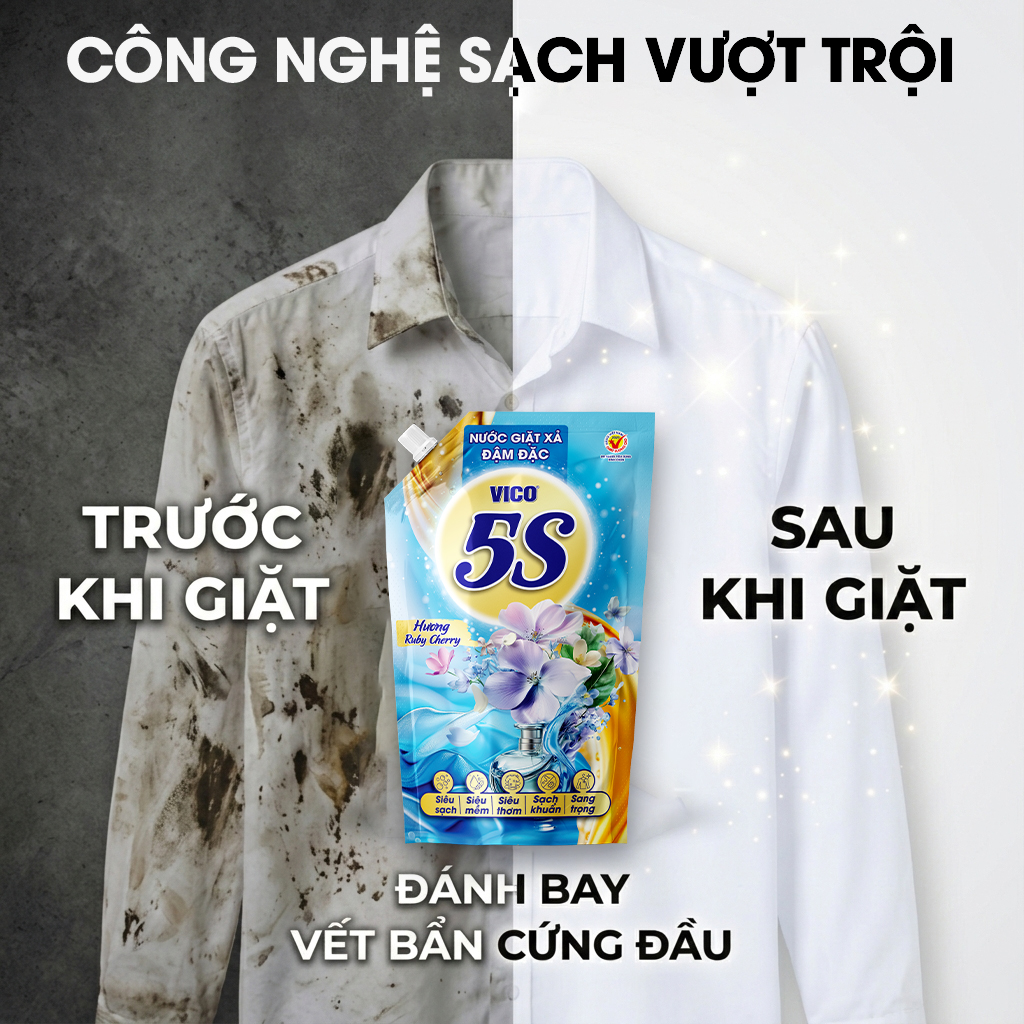 Túi nước giặt xả Vico 5S 1.5kg tiếp tục phát huy thế mạnh với công thức 5S ưu việt: