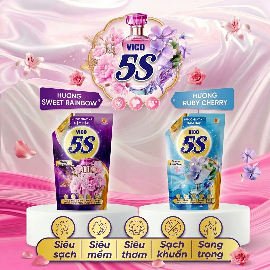 Túi nước giặt xả Vico 5S 1.5kg tiếp tục phát huy thế mạnh với công thức 5S ưu việt: